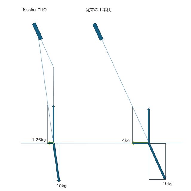 10kgの荷重をグリップ部にかけた場合、Issoku-CHO(1足長)は約1.25kgの摩擦力を必要とします。それに対して、従来のまっすぐなポールは3倍以上の約4kgの摩擦力を必要とします。Issoku-CHO(1足長)を使った人が「ポールの先端が滑りにくい」「先が逃げない」というのはそのような理由です。