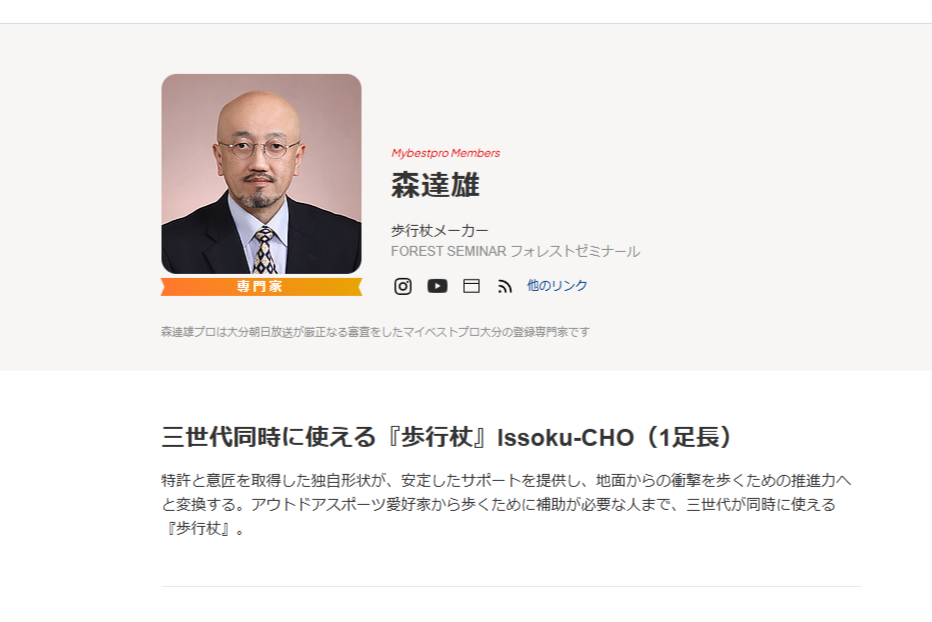 大分朝日放送の『マイベストプロ』に「三世代同時に使える歩行杖Issoku-CHO(1足長)のプロ」として登録 (2025.5.13) 2025 11/17 Healthcare 2025-11-17 大分朝日放送の『マイベストプロ』へ登録されました。https://mbp-japan.com/oita/morifam/ Healthcare この記事が気に入ったら フォローしてね! Follow Me よかったらシェアしてね! URLをコピーする URLをコピーしました! URLをコピーしました! 大分ケーブルテレコム『我が社の商品見せまSHOW!』に出演 MEDICAL TAIWAN (2025.6.5~6.7) 関連記事 パーキンソン病と杖選び:Issoku-CHO(1足長)との出会い 2025-11-22 Forbes JAPAN (2025.10.29) 2025-11-18 九州・山口ベンチャーマーケット (2025.10.21) 2025-11-18 H.C.R.国際福祉機器展 (2025.10.8~10) 2025-11-18 OBS感謝祭 (2025.9.28) 2025-11-18 東九州メディカルバレー構想 本郷展示・商談会 (2025.8.29) 2025-11-17 Japan Health (2025.6.25~27) 2025-11-17 九州ニュービジネス大賞 (2025.6.11) 2025-11-17